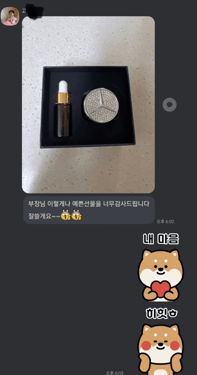 한 고객님은 출고시 받은 벤츠선물도 좋았지만 평소 필요했던 이쁜 벤츠 방향제를 선물 받으니 기분이 너무 좋다고 감사하다는 인사말과 인증샷을 보내주셨습니다.